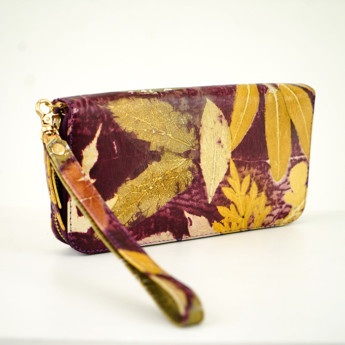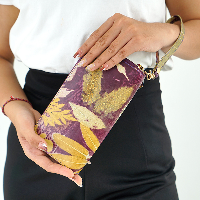 Leather Wallet Ecoprint made of leather with ecoprint motif. Its products print natural motifs (leaves, flowers and natural dyes) called eco prints. The work is done on leather that has been processed, using this product is expected to support green life by reducing synthetic dyes that produce harmful pollutants to our earth. However, you can still look fashionable by using this product while protecting the earth.
